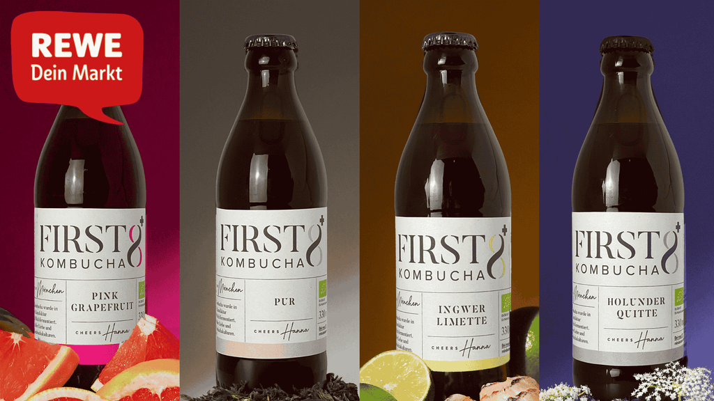 Gemeinsam bringen wir Kombucha ins Regal – dauerhaft. Hol dir FIRST8 jetzt bei REWE, solange der Vorrat reicht!